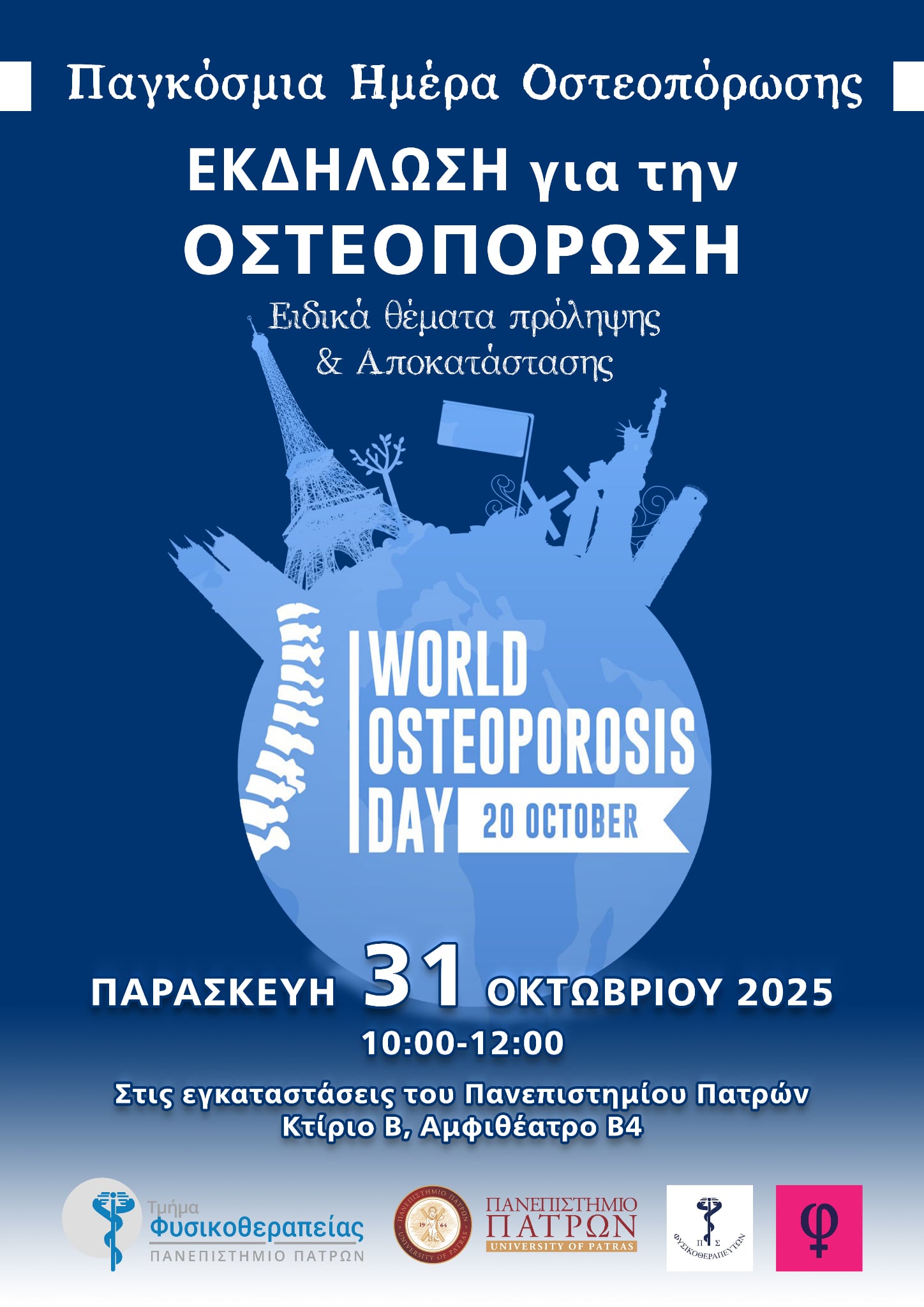 Εκδήλωση για την οστεοπόρωση, 31.10.2025 Παγκόσμια Ημέρα Οστεοπόρωσης Εκδήλωση για την Οστεοπόρωση Ειδικά θέματα πρόληψης & αποκατάστασης Παρασκευή 31 Οκτωβρίου 2025 10:00 – 12:00 Στις εγκαταστάσεις του Πανεπιστημίου Πατρών Κτίριο Β, Αμφιθέατρο Β4 physio1adm2025-10-24T09:04:30+03:00